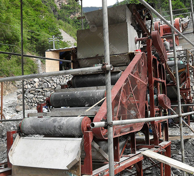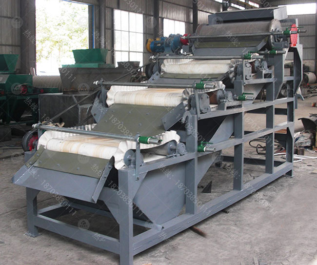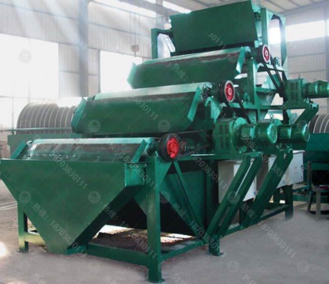 将原矿送入上料斗,经过振动电机振动布料,出料量可通过手轮来进行准确调整。磁辊通过调速电机拖动,转速的快慢通过调速表来进行调节,可控制磁选机的产量和精矿品位。矿粒经输送带被送入上磁辊分选,由于褐铁矿,赤铁矿,氧化锰,碳酸锰矿的矿粒有磁性,立即被强磁场吸附在磁辊上,脉石粒(杂石、砂土)由于没有磁性(磁性很弱),磁辊的强磁对它不产生吸力,随着磁辊的转动,矿粒一直被吸在磁辊上,而脉石粒在磁辊转到前端位置时被抛出掉在隔矿板的前面(通过改变隔矿板角度的大小可调整精矿的品位),矿粒继续被磁辊带到脱磁区时自动掉入一选集矿斗收集为精矿成品。由于上磁辊掉下的脉石中还夹带有一些磁性更弱的矿粒,它们将进入下磁辊继续进行磁选,磁选后的成品矿粒进入二选集矿斗收集为成品,被抛出的脉石经尾矿口排出,至此磁选工序结束。